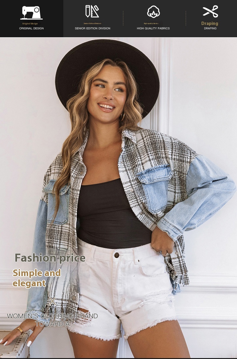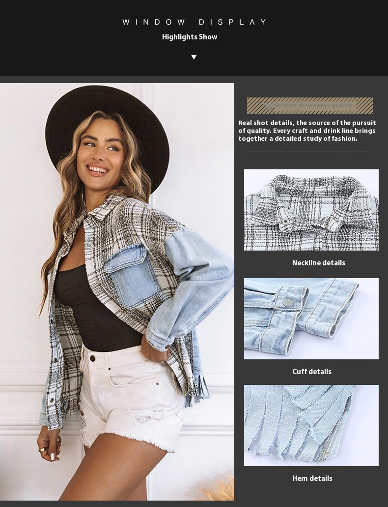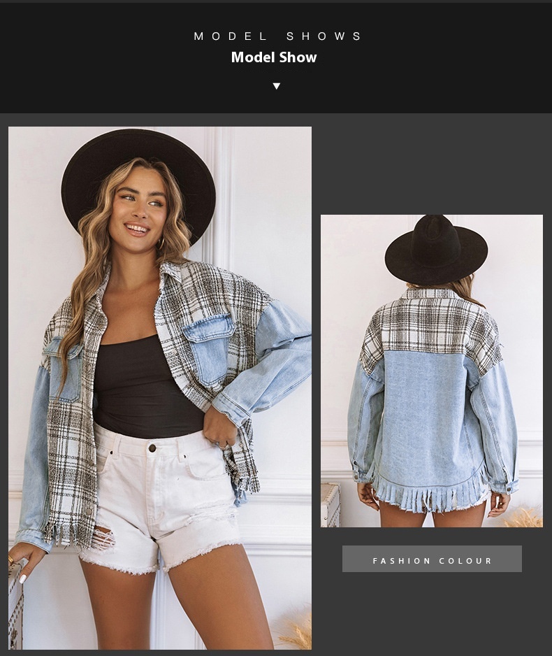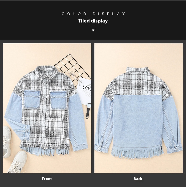 Women's Plaid Patchwork Tassel Flap Pocket Denim Jacket