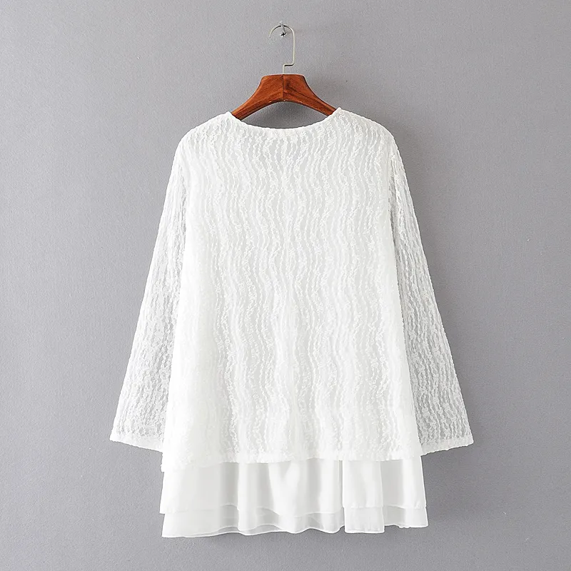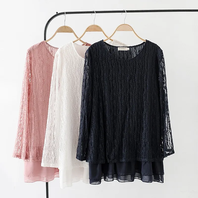 Women's Plus Fertilizer Spring Loose And Thin Ladies Lace Stitching Long-Sleeved Chiffon Shirt