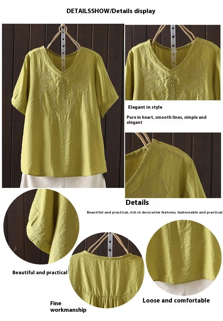 Women's Cotton and Linen Embroidery Loose T-shirt