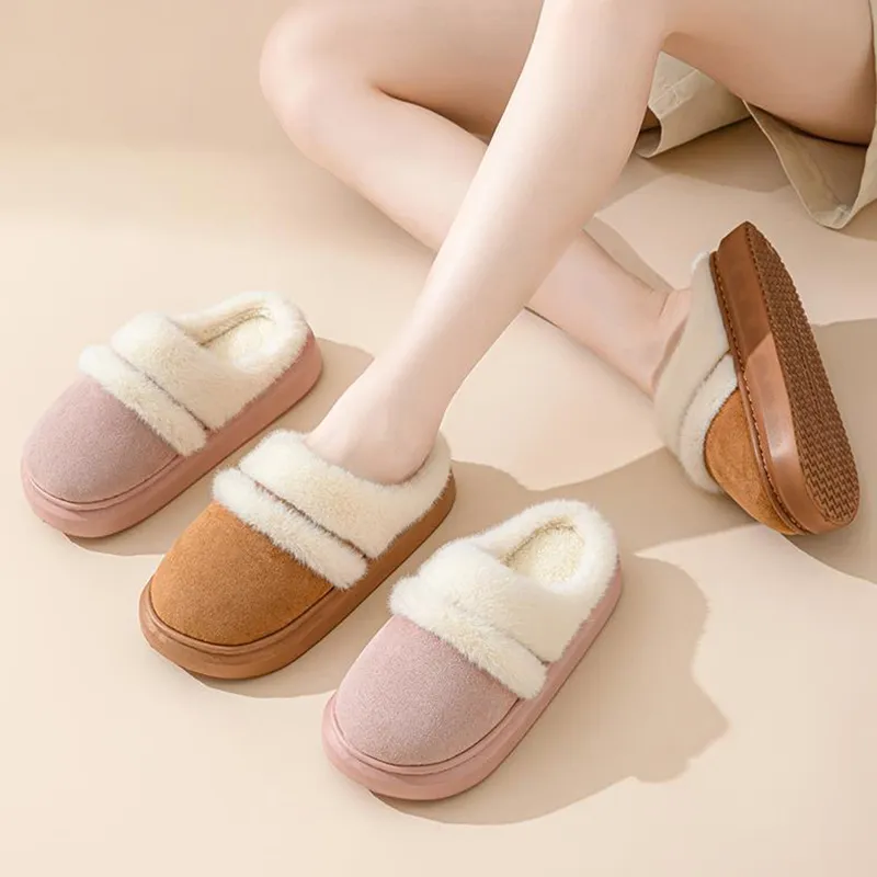 Womens Warm Cotton Slippers Thick Bottom, Non-slip Plus-Velvet Suede House Shoes