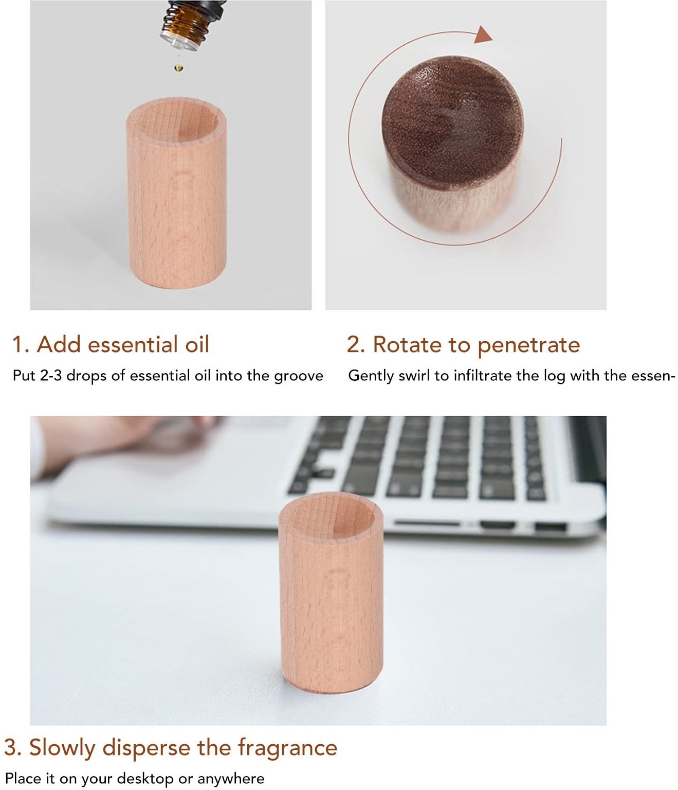 - Easy to use: Just apply 3 to 4 drops of your favorite essential oil on top of the wood and wait for it to be absorbed. The wood diffuser works perfect with the essential oil, which allow the oil to volatilize without heat, releasing fragrant aroma that brings you spirited joy.