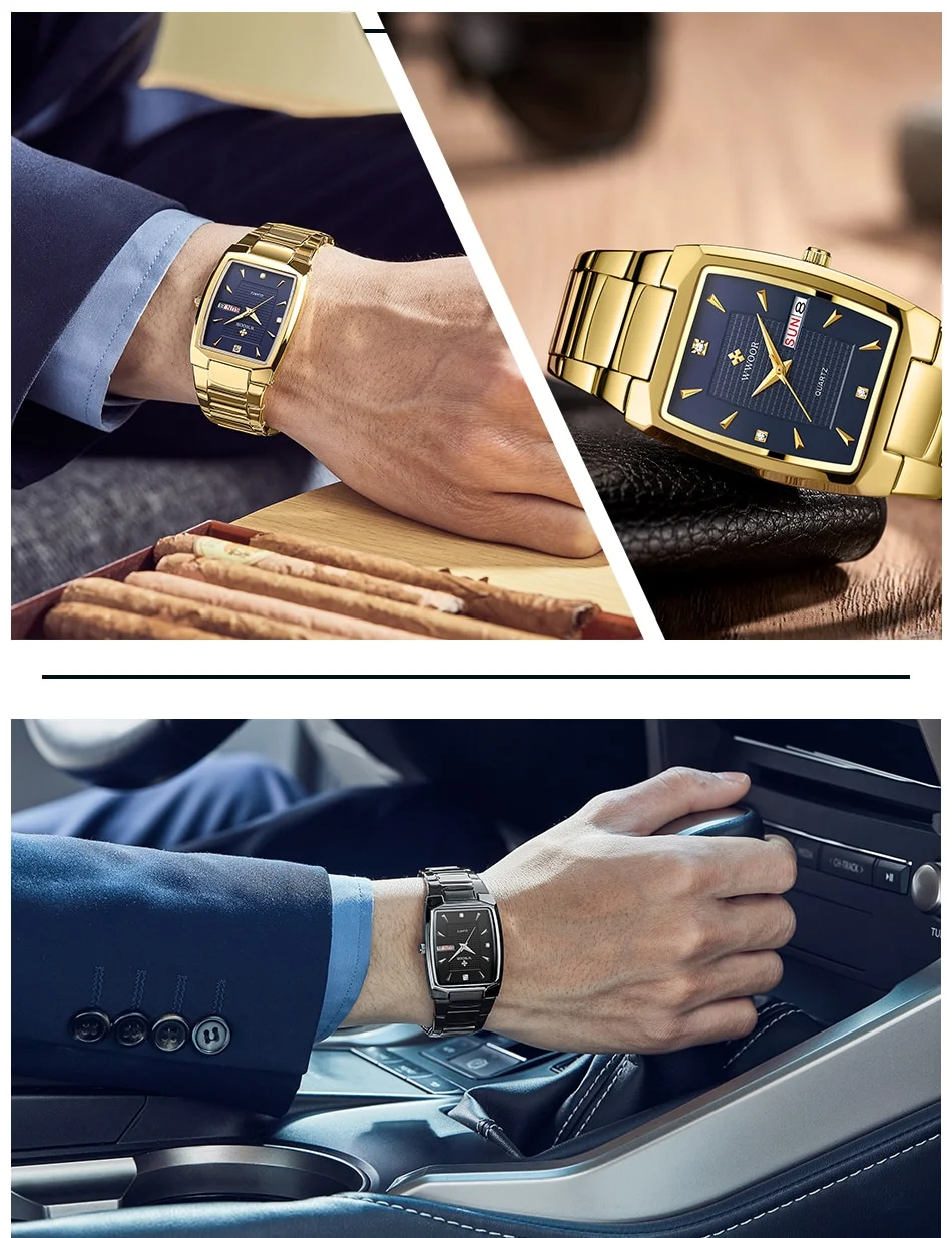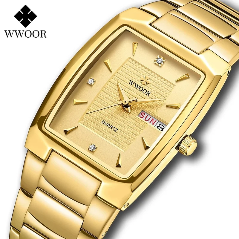 WWOOR 2024 Mens Square Watch Luxury Gold Stainless Steel Quartz Wristwatch