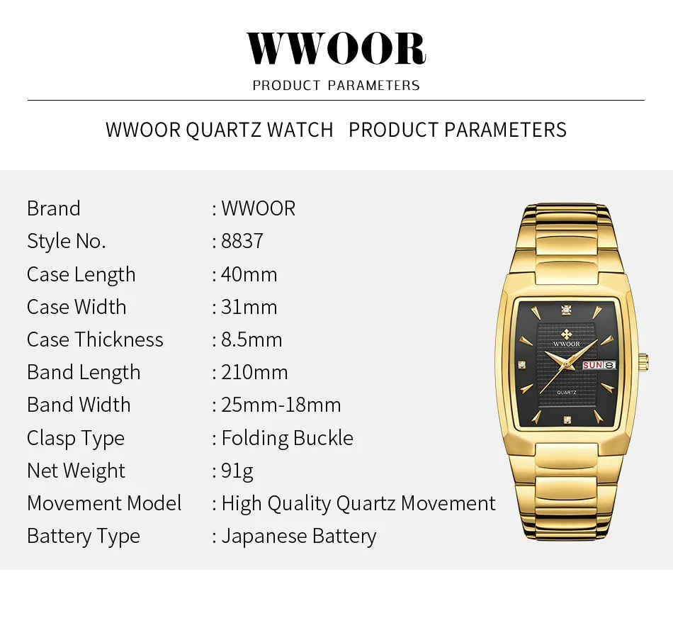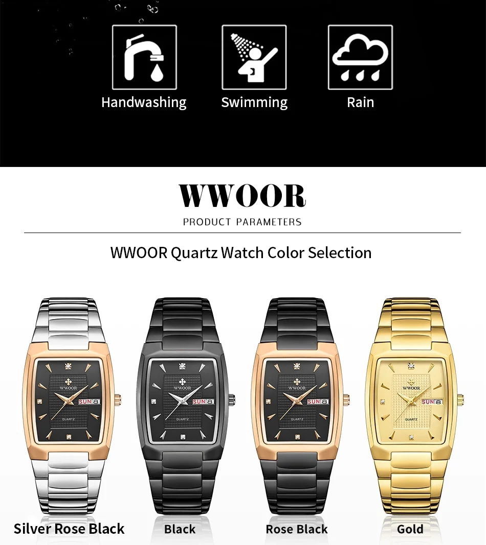 Perfect for daily wear or special events, the WWOOR 2024 Men’s Square Watch brings together beauty, quality, and practicality in one sophisticated package. Add this luxury watch to your collection and enjoy the elegance and versatility it brings to your look.