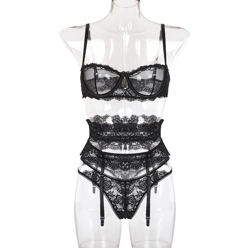 Yimunancy 3-piece Lingerie Set Women Transparent Sexy Bra Set Ladies Lace Lingerie Intimates Underwear Set