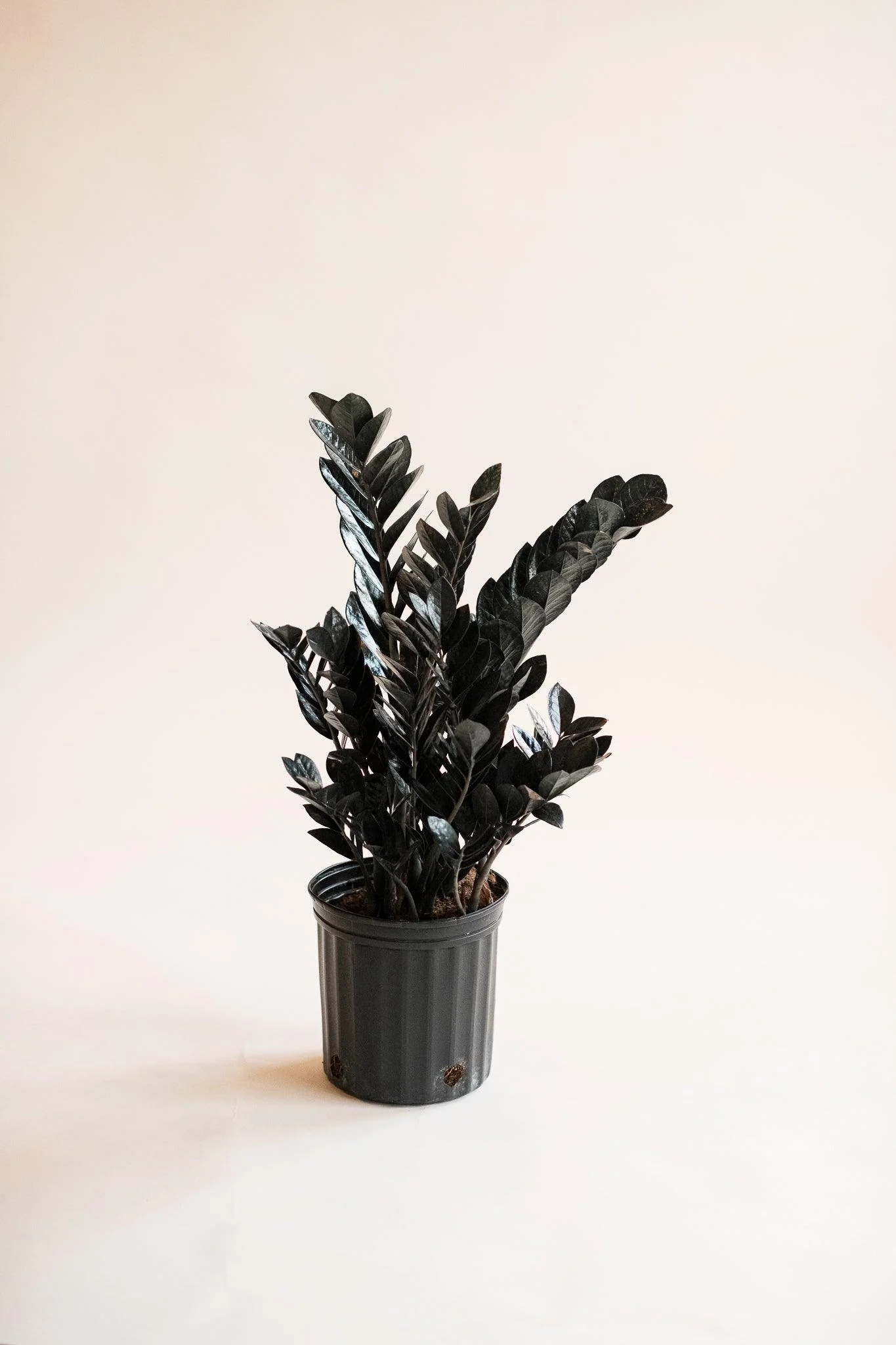 Zamioculcas 'Black' features thick, waxy leaves that are a deep, almost black-green color. The foliage is smooth and glossy, giving the plant a luxurious and modern look. The leaves grow on upright, sturdy stems that emerge from a central rhizome. This dark coloration sets it apart from the standard ZZ Plant, making it a striking addition to any plant collection.