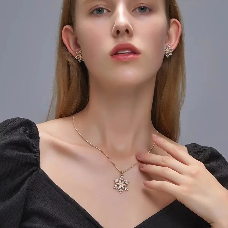 Add a touch of elegance and charm to your jewelry collection with the Exquisite Zircon Snowflake Necklace for women. This light luxury necklace features an ice flower pendant adorned with brilliant zircon stones, creating a captivating, shimmering effect that catches the light beautifully. Designed for women who appreciate high-quality craftsmanship and timeless style, this necklace and earring set is perfect for weddings, Christmas, and any special occasion.